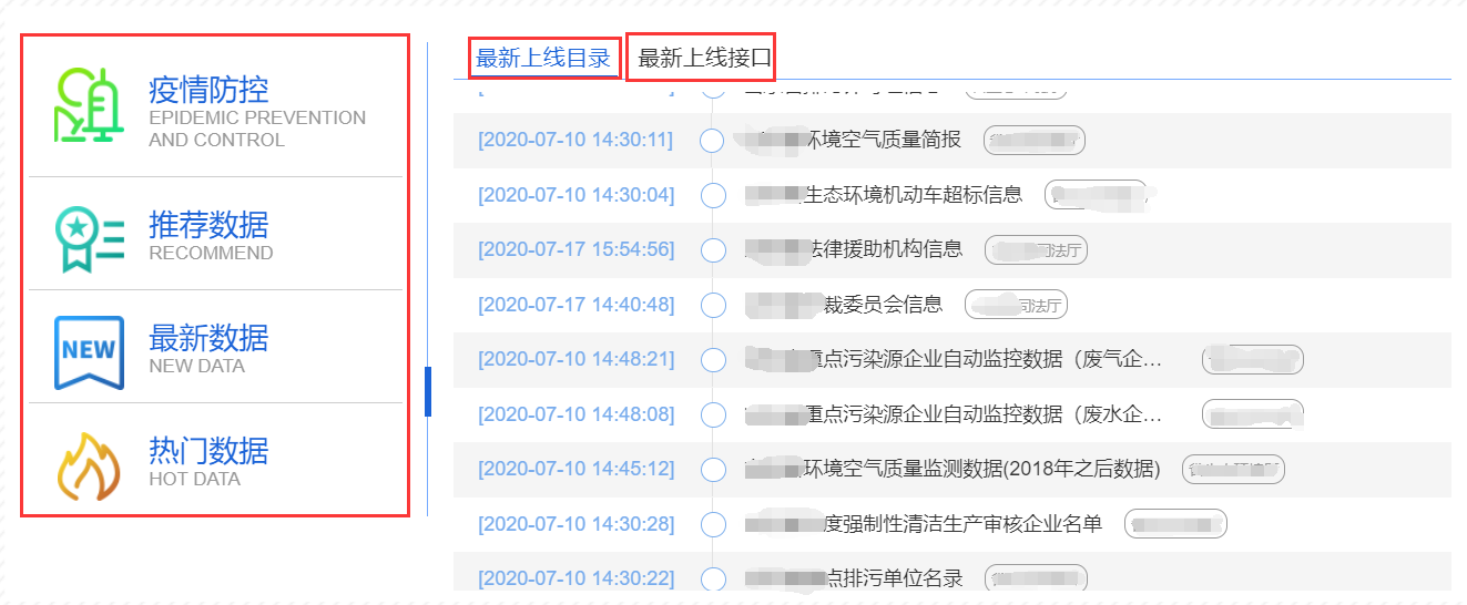 公共数据开放网站首页中设有根据发生时事(如下图中的疫情防控)和用户的浏览记录提供的推荐数据,以及最新数据和用户浏览最多的热门数据,共四个菜单。在最新数据和热门数据菜单中,还分为数据目录和数据接口两类。用户可根据需要,浏览各菜单分类下的数据,选择感兴趣的点击进入。